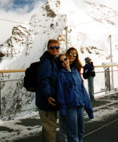 This is Lisa and the girls standing on the observation platform at the Jungfraujoch, referred to as "The Top of Europe". It's about 11,365 feet high. The mountain behind them is the south face of the Eiger.