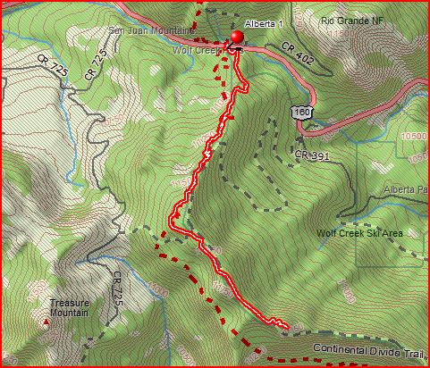 The hike would start at the parking area at Wolf Creek Pass, and go to Alberta Peak, as seen in the map below. The route to the peak is shown in red with a yellow center. The trip to the top was about 3 miles, with an elevation gain of 1370 feet and an average grade of 10 percent.